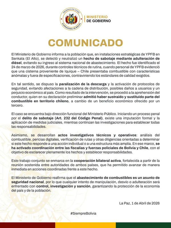 El Ministerio de Gobierno reafirmó que el abastecimiento de combustibles es un asunto de seguridad nacional. Entretanto, advirtió que cualquier intento de manipulación, desvío o adulteración se asumirá con control, investigación y sanción. Todo con el fin de proteger la economía del país y a la población.