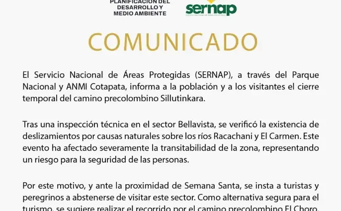 El Servicio Nacional de Áreas Protegidas (Sernap) determinó el cierre temporal del camino precolombino Sillutinkara, ubicado en el Parque Nacional y Área Natural de Manejo Integrado Cotapata, tras evidenciarse riesgos para la transitabilidad en la zona. Según un comunicado oficial, la decisión fue asumida luego de una inspección técnica realizadaSeguir leyendo